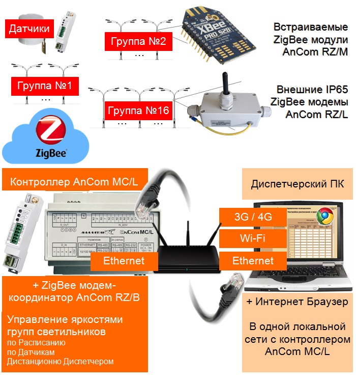 - Через встраиваемые в светильники ZigBee-модули AnCom RZ/M. Рекомендуется производителям светильников.